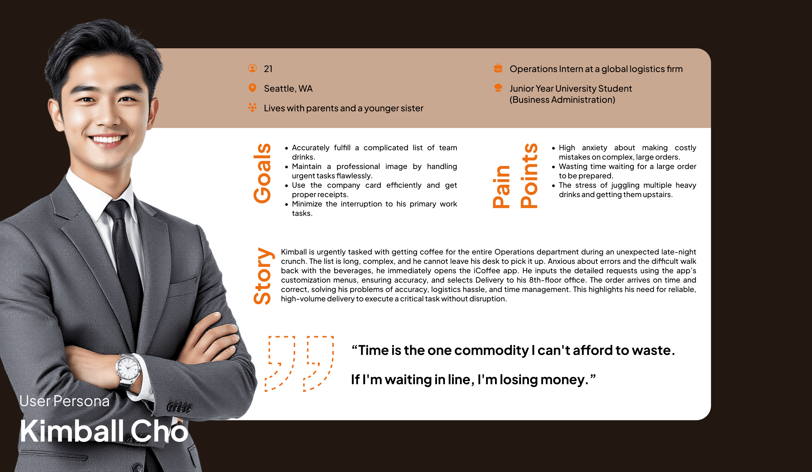 Meet Kimball Cho who is an anxious intern responsible for fulfilling large, detailed team orders who needs a streamlined, high-accuracy delivery system because he is under high pressure to execute flawlessly and cannot risk errors or logistical hassle, requiring a reliable digital solution that eliminates manual transportation and ensures all complex custom drinks arrive correctly and on time.