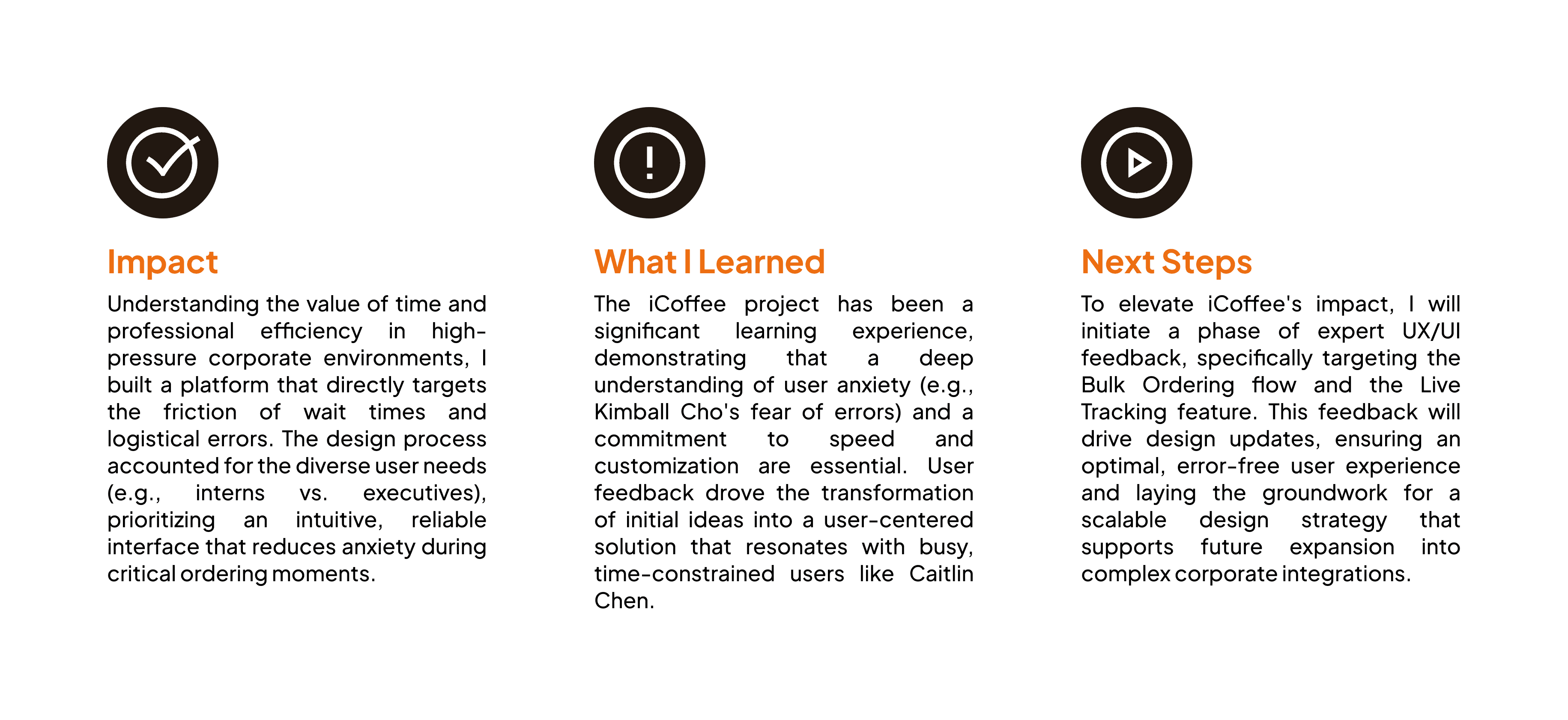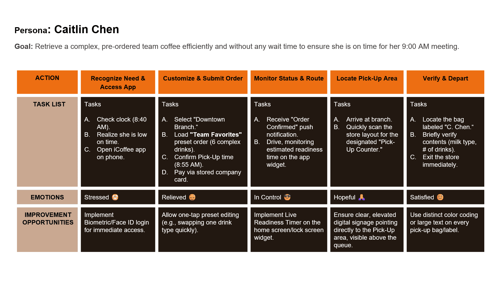 By creating a user journey map, I aimed to illustrate the process of how Caitlin Chen behaves, feels, and what she thinks while accomplishing her goal of retrieving a complex team order without waiting in line using the iCoffee app. This helps to address potential pain points like long wait times and order errors and identify opportunities for moments of efficiency and professional productivity.