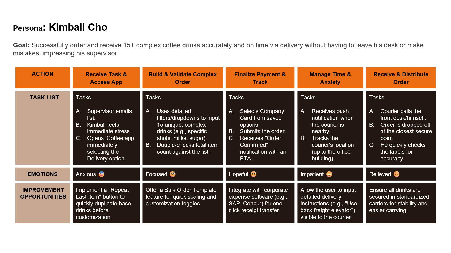 By creating a user journey map, I aimed to illustrate the process of how Kimball Cho behaves, feels, and what he thinks while accomplishing his goal of ordering and receiving a large delivery of complex coffee orders using the iCoffee app. This helps to address potential pain points like high anxiety over order errors and logistical transportation issues and identify opportunities for moments of flawless execution and professional relief.