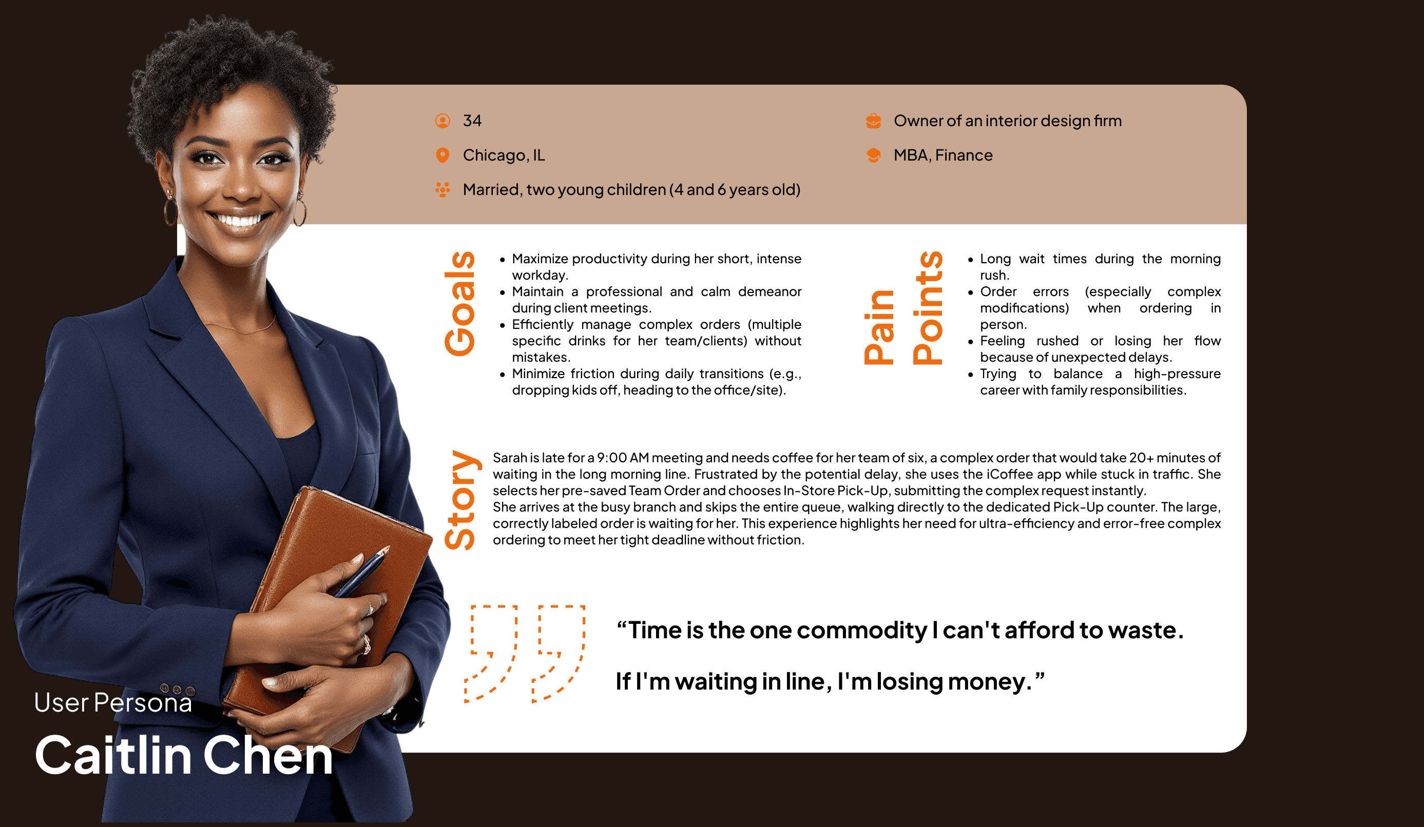 Meet Caitlin Chen who is a busy, productivity-focused business owner who needs a reliable, expedited way to retrieve complex, multi-item coffee orders because she is managing a tight schedule and cannot afford long waiting times or order errors, requiring an efficient digital solution that maximizes her professional productivity and minimizes time wasted in line.